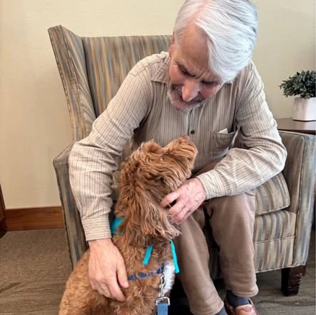 A therapy dog team is a friendly pet paired with their happy human. Together they bring joy to others. Therapy dogs are not service dogs, although service dogs may also be therapy dogs.